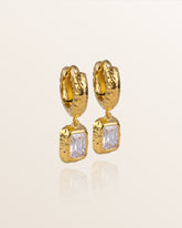 These stunning drop earrings feature a clear stone that captures light beautifully. Crafted in 18ct gold, their vibrant hue and hammered texture make them an eye-catching statement piece. Match with our Green cosmic gemstone ring.