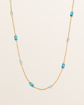 This delicate gold necklace features beautiful blue gemstones, set in 18ct plated gold. Perfect for layering, this necklace adds elegance and colour to any outfit. Whether worn alone for a subtle touch or stacked with chunky gold chains for a bold look, it’s a versatile piece for any occasion.